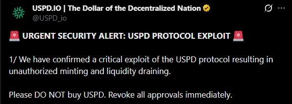 稳定币协议团队已确认12 月 5 日清晨发生的这起高度复杂的安全漏洞事件,敦促用户避免购买 USPD,并立即撤销所有授权,因为安全漏洞仍在持续。