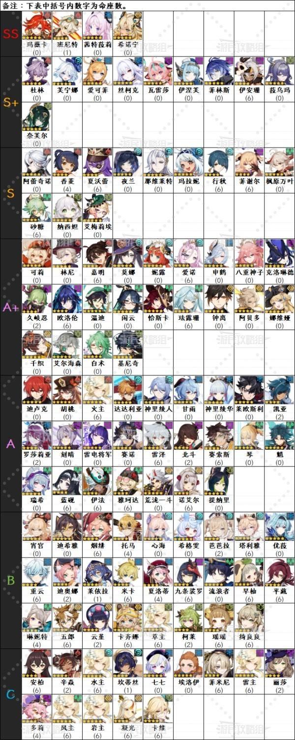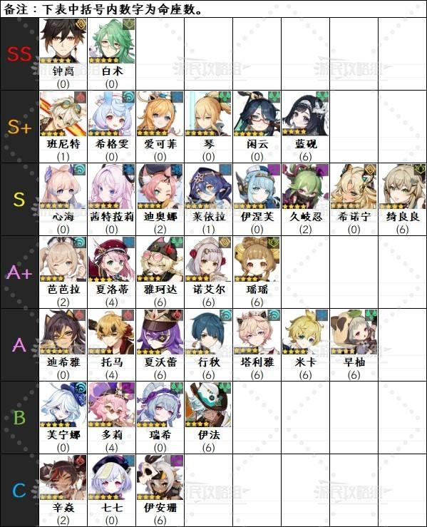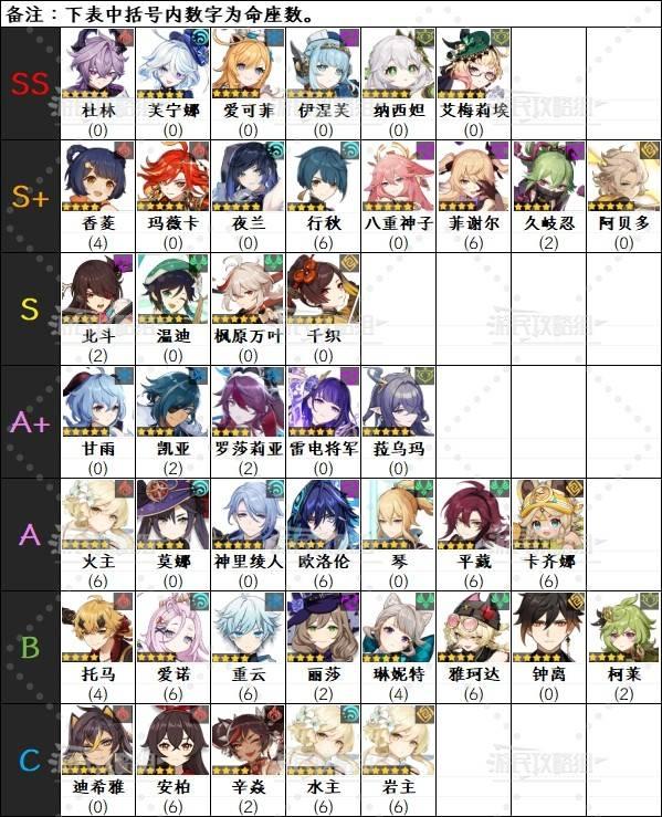 ※下方角色名后括号内数字为命座数,角色排名可能会受其他因素影响。