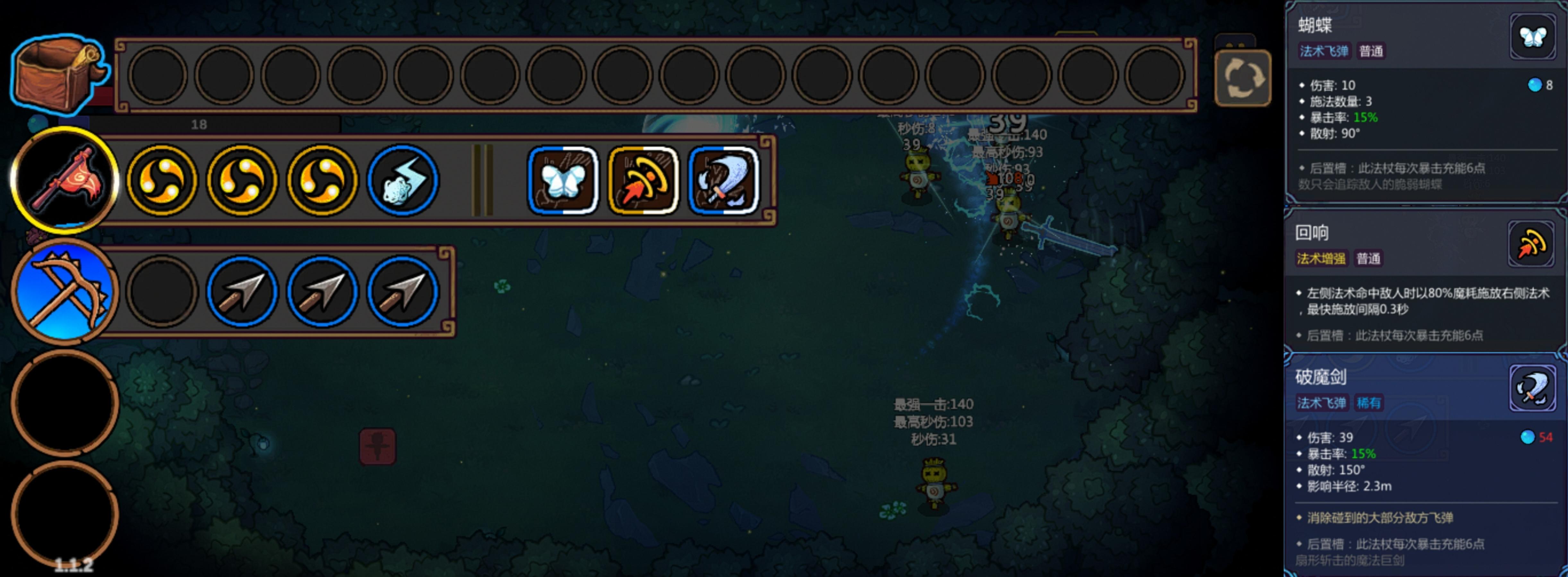 暴击充能蝴蝶,蝴蝶命中消耗法力释放破魔剑,充分利用法杖自身的法力打伤害。
