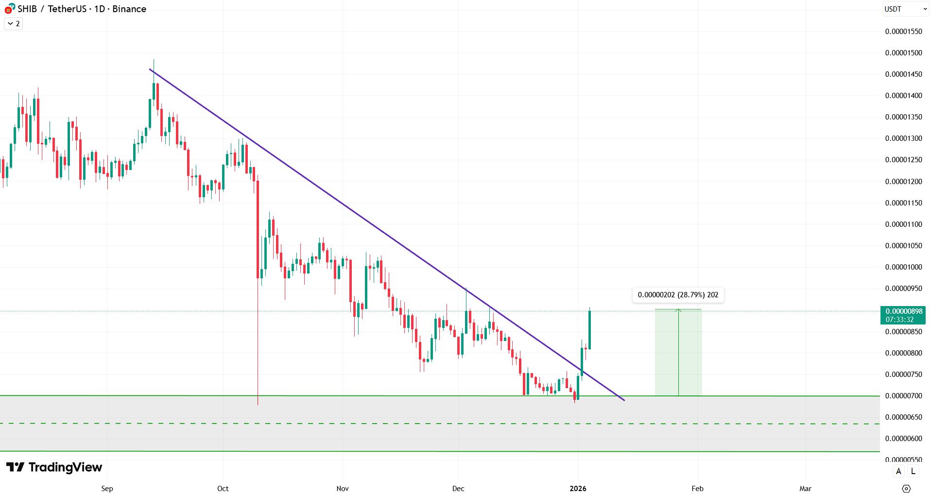 柴犬 从 2025 年的低点反弹,分析表明,干净利落的下跌趋势突破表明该代币已经触底。