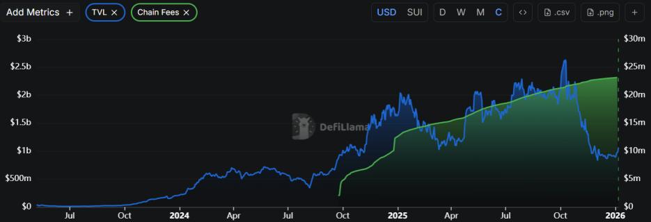 自2023年5月主网上线以来,其TVL飙升了约32倍,并于2025年10月达到26亿美元的峰值。不过,因“10·11闪崩”的影响,Sui TVL持续走低,目前仅10亿美元左右,跌破腰斩线。