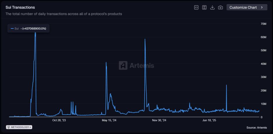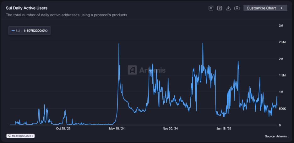 在用户活跃度方面,Sui的日活用户数量上线初期仅数万,但此后急剧攀升,并于2025年4月达到250万的峰值。虽然近期有所回落,但月均数据仍维持在健康水平。截至目前,其平均日活用户数量仍维持在60万左右。