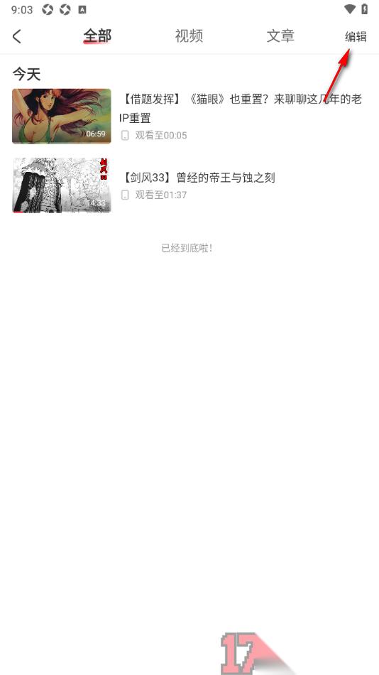 3.那么页面上就会呈现出平时观看过的所有视频、文章等内容,在这里将页面右侧显示的【编辑】选项点击一下。