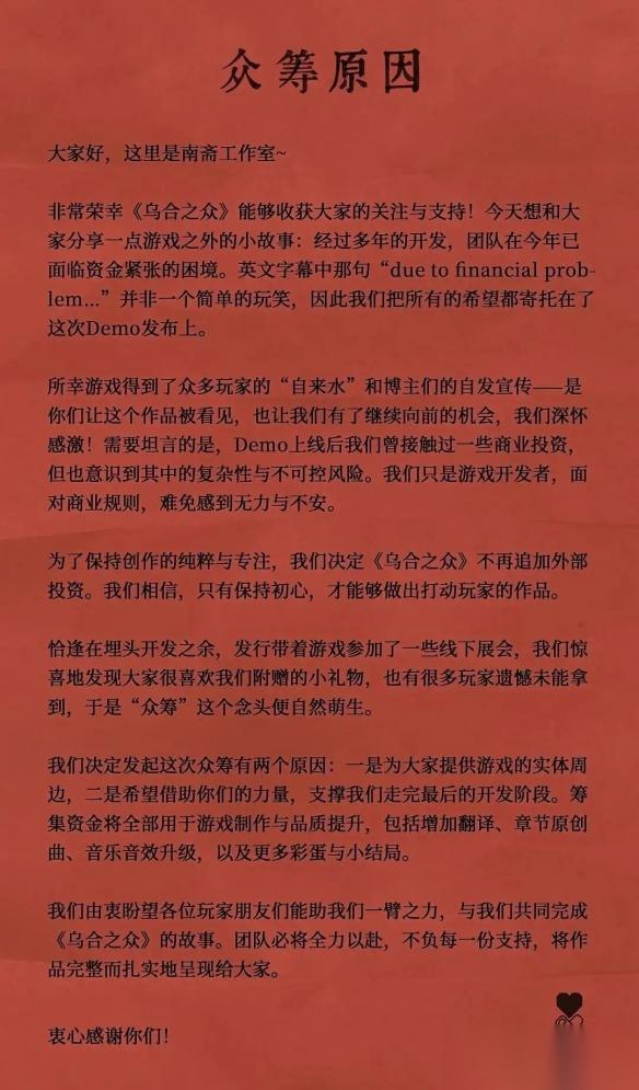 近日,中式恐怖游戏《乌和之众》官方公布了众筹计划,将于2026年1月11日下午两点在【新物集App】平台开启。众筹共设12个档位,价格区间为40元至1888元,其中40元、43元、498元及1888元为限量档位。本次众筹主要发售游戏周边实物,而非游戏本身,实物预计于2026年6月发货。