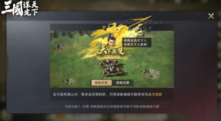 活动内容:主公可透过活动签到或使用玉石购买「奇珍礼券」抽取连斩播报特效「金戈流影」,以及多款聊天框、头像框等珍稀外观。同时官方也将同步推出「威震八方」活动,全服赠送「战八方」战法特效,让战场表现更加霸气十足。