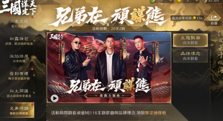 活动内容:活动期间,主公可于游戏内观看顽童 MJ116 的官方游戏主题曲与品牌理念宣传片,并完成指定分享任务,即可获得限定奖励「顽世不恭」专属头像框,象征兄弟并肩、谋略称王的精神。