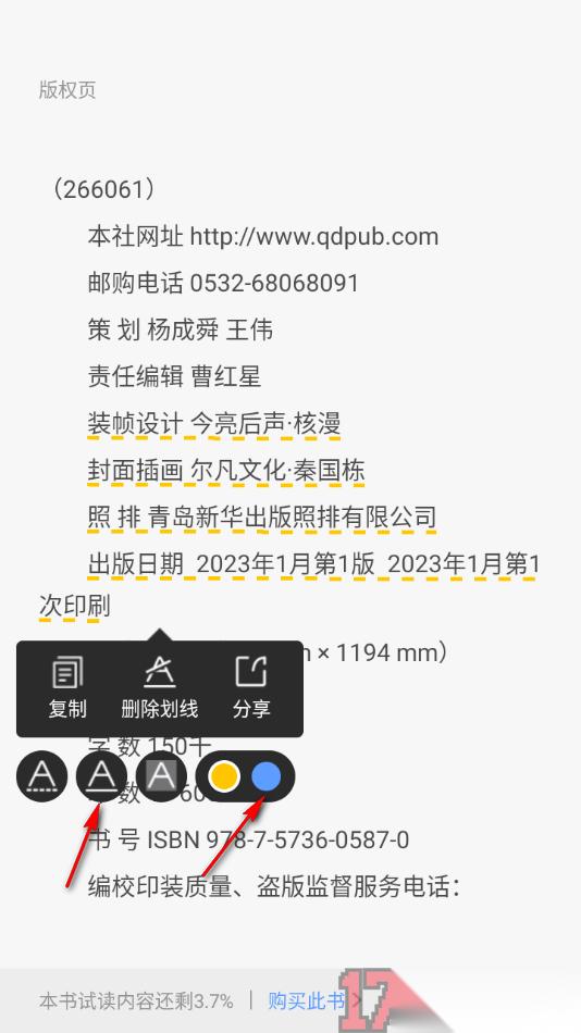 4.这时候即可查看到划线线条的形状和颜色已经更改好了,还可以将划线的内容进行分享和复制操作,如图所示。