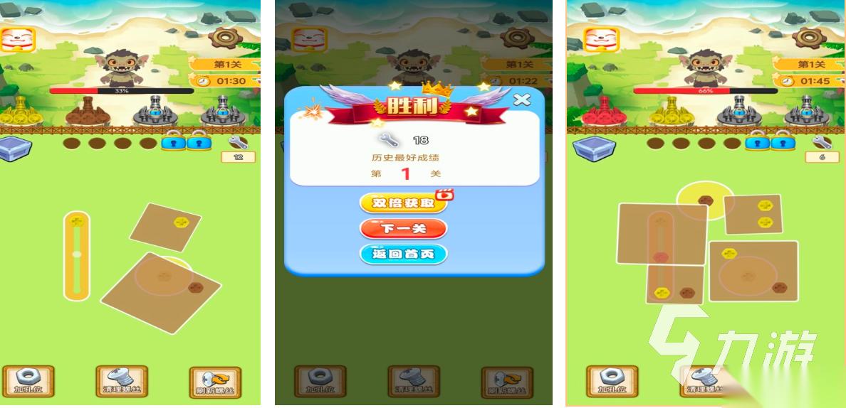 《螺丝掘金达人》将益智解谜与机械挖掘相结合,和传统的垂直挖掘不一样的是,该游戏要求玩家用拆卸和组装机械螺丝来驱动大型挖掘机器在沙漠中前进。每一层地表都像是一把精密的机械锁,玩家必须转动正确的螺丝才能解除障碍让掘金钻头钻入地层提取黄金。游戏中还有强力磁铁和加压装置等特殊道具,强力磁铁可以瞬间吸附周围金属矿产,加压装置可以短时间突破硬质合金墙,每个道具能带给玩家们性能加持。