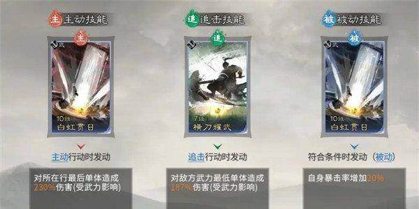 然后张辽的话,在这里可以带白虹贯日之类的技能,对面的敌人造成输出的时候,是根据所在行列的敌人,对他造成输出之后还可以根据张辽自身天赋带来足够的点杀能力,后期追击的话,大家可以带横刀耀武,这个技能对敌方目前武力数值最低的一个目标来说,造成的伤害是能够达到最高数值的,蔡文姬在这个阵容里面就是辅助定位的角色,她能够带来的一个主力技能就用鼎力相助技能,这样的话就可以让踩中追击格子的武将带来足够的伤害加成。