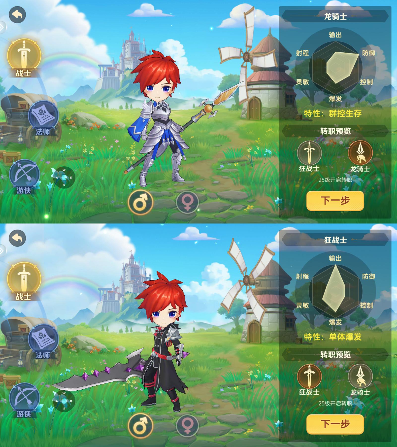 战士转职:狂战士(单体爆发)、龙骑士(群控生存)