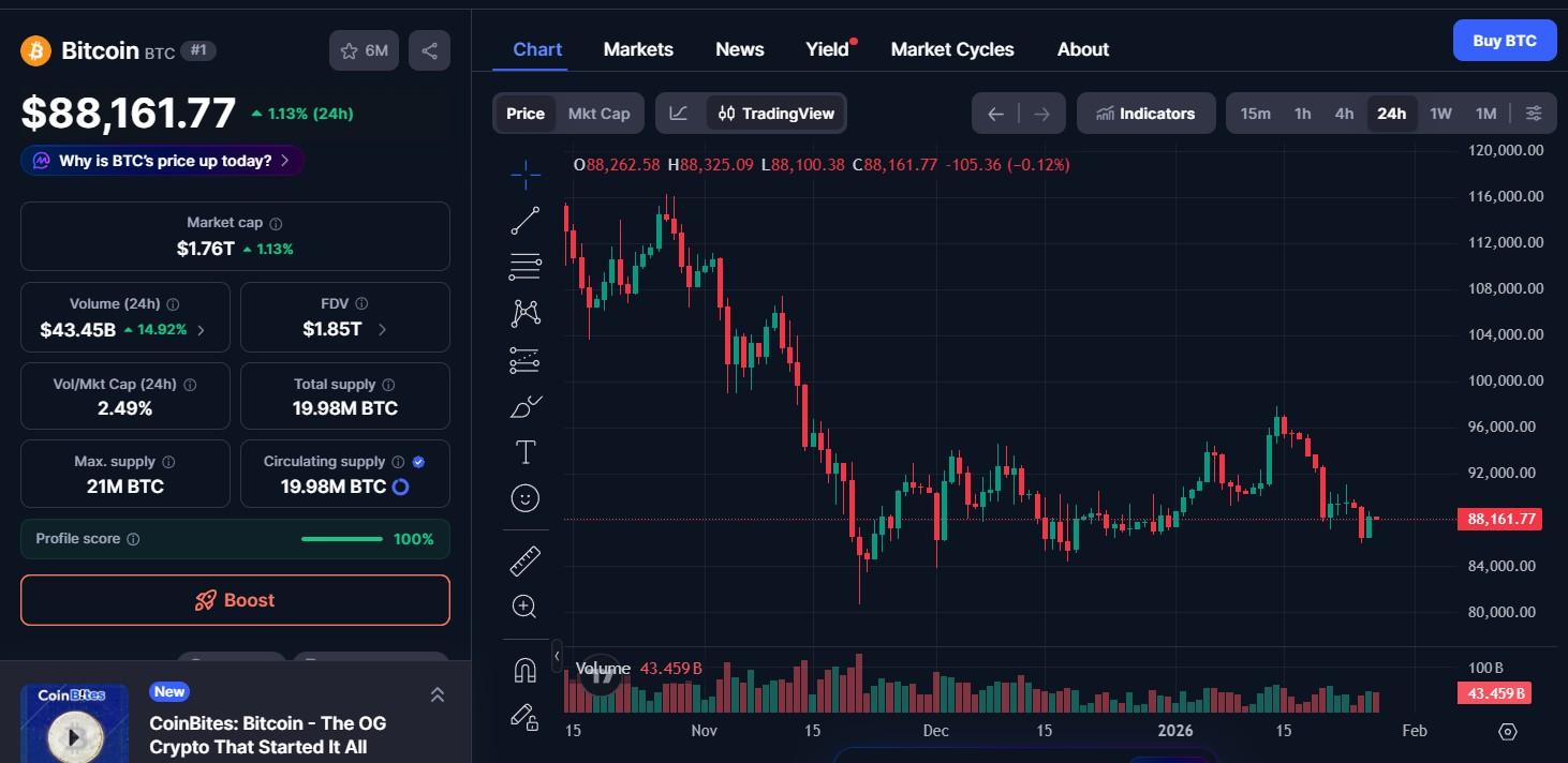 比特币价格(BTC):88,244.57 美元,24 小时内增长 0.79%,电视:430 亿美元。