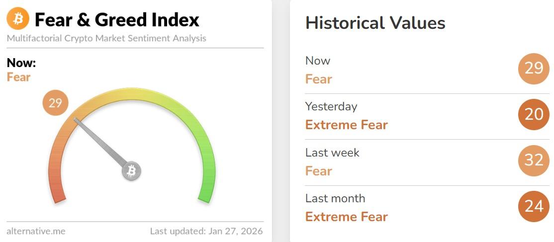 今日加密货币恐惧与贪婪指数为29(恐惧),较昨日的20(极度恐惧)有所改善,但仍低于上周的32。尽管价格略有企稳,但持续的价格疲软、成交量低迷以及宏观经济的不确定性,令市场情绪依然谨慎。
