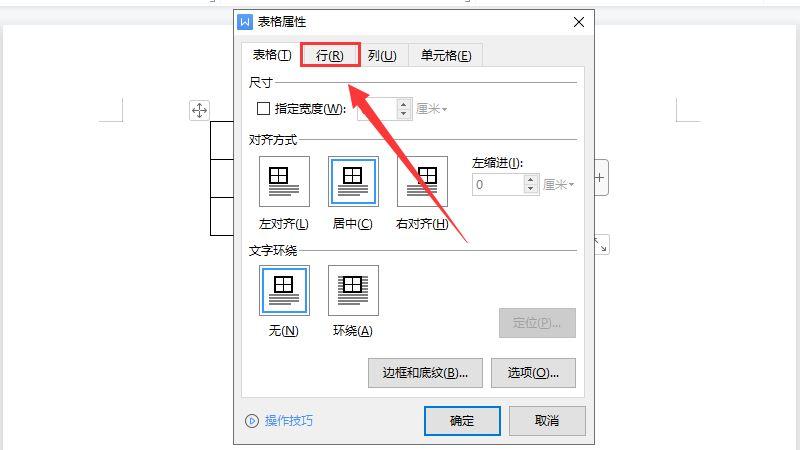 2、点击“行”选项。在表格属性窗口中点击“行”选项。