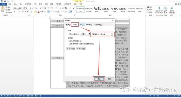 2、在“表格属性”对话框中,点击【行】,将“尺寸”-“行高值是”设置为:最小值,然后点击【确定】,这样表格内文字全部显示。