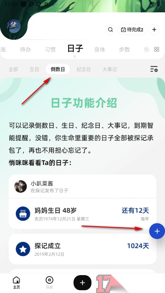 探记app是一款专门为用户提供了日常生活相关的编辑内容的应用软件,包含的内容有记账、待办、习惯、日子以及身体等相关信息,其中日子功能下还包含了生日、倒数日、纪念日以及大事记等内容,若是平时总是会忘记重要的好友、家人等生日,那么可以通过设置倒数日的方式来记录详情,之后页面上会显示出所设置的日子的倒数时间还剩多少天,当时间到了就会在第一时间提醒用户,从而可以避免错过重要的日子的情况发生,对此直接打开首页面导航栏中的“日子”功能,找到倒数日即可根据需求添加。