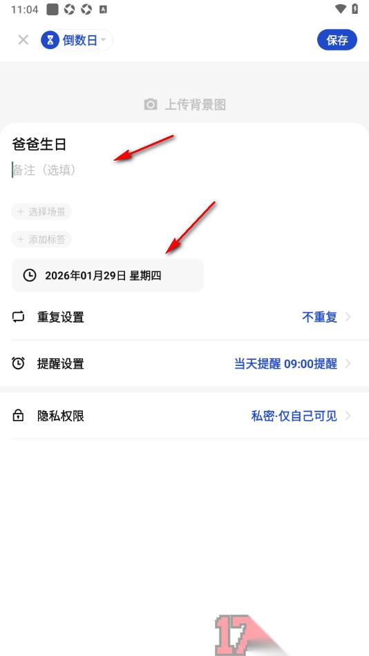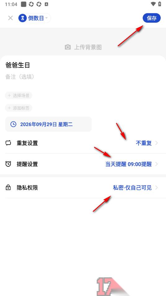 4.之后再根据自己的需求设置一下该倒数日的重复提醒、提醒的具体时间以及访问权限等,之后点击上方的【保存】按钮即可。