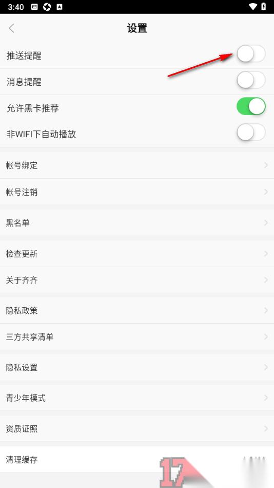 齐齐直播APP是一款小伙伴们平时常常在使用的直播交流软件,相信很多用户对于该应用有一定的了解,打开该应用呈现出多种多样的直播内容,用户可以选择其中感兴趣的的直播互动聊天,同时还可以开启推送提醒,当关注的主播开直播时,系统就会在第一时间推送直播动态通知,防止自己不小心错过重要主播的直播动态内容,对此直接将该应用中的应用设置窗口打开,找到推送提醒功能点击一下即可启用,除此之外用户还可以根据需求设置消息提醒、允许黑卡推荐、非WIFI下自动播放等相关功能内容。