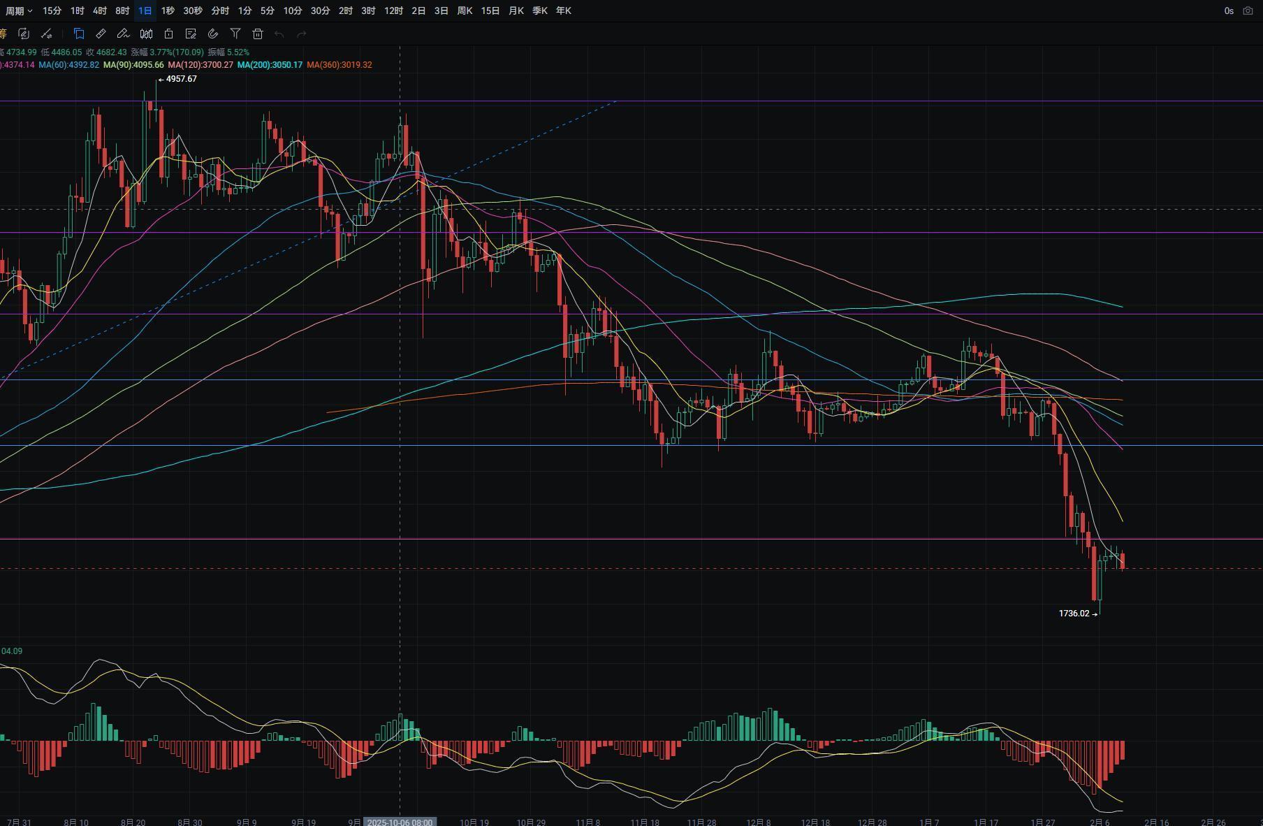 K线动能方面,由于从高点340O附近连续三连阴的大阴线砸盘至1750,说明空头动能释放处于“主跌浪”阶段,一般主跌浪过后需要宽幅震荡调整,即便暴力反弹也需要筑底结构,参考24年8月份三连阴后价格在底部形成了长时间的震荡结构,后续才有的反弹。