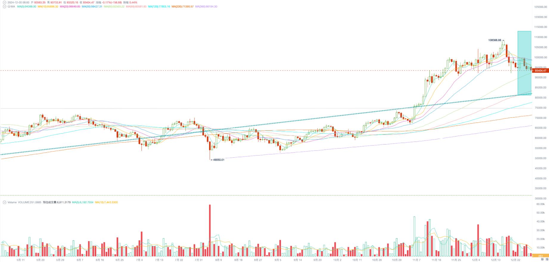 BTC 开于 95091.15 美元,收于 93563.35 美元,全周录得 1.60% 下跌,振幅 7.91%,成交量下降明显。