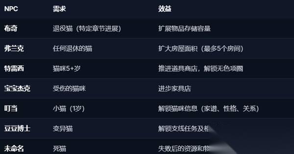 对于其他NPC,你可以在房屋阶段产生捐款。让猫自然衰老,为了特蕾西,允许战斗产生受伤的猫,或者专门繁殖变异以满足豆豆博士的要求。