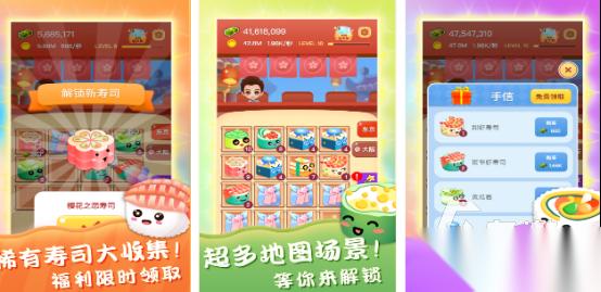 热门的高人气游戏,以模拟经营为题材,化身成为寿司厨神体验经营的乐趣,采用独特的休闲卡通风格,色彩超级丰富,画面非常可爱,给玩家带来轻松又愉悦的体验感,推送出放置合成这样的核心玩法,通过点击包装盒生成寿司,将两个相同等级寿司合成更高等级,这样就能够成功获得收益,游戏有多个厨房可任意创作。