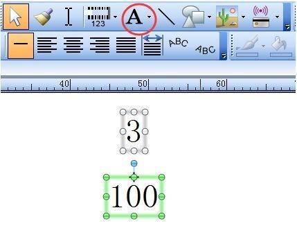 1、在BarTender中,点击工具栏中的文本按钮,创建两个单行文本,一个输入分数中的分子,另一个文本中输入分母;
