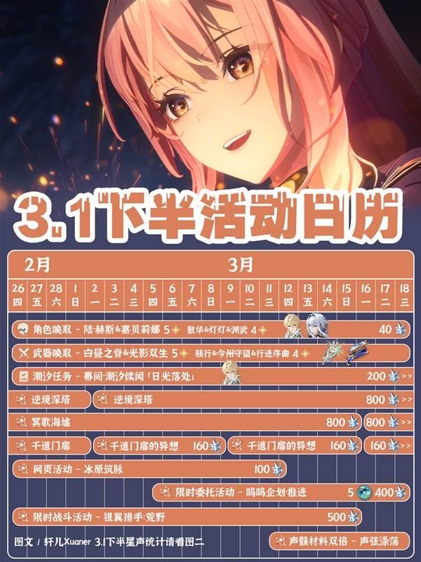 《鸣潮》3.1下半会上线很多新的活动,那么活动有哪些,又能获得多少星声呢?下面请看由“轩儿Xuaner”带来的《鸣潮》3.1下半活动日历,一起来看看吧。