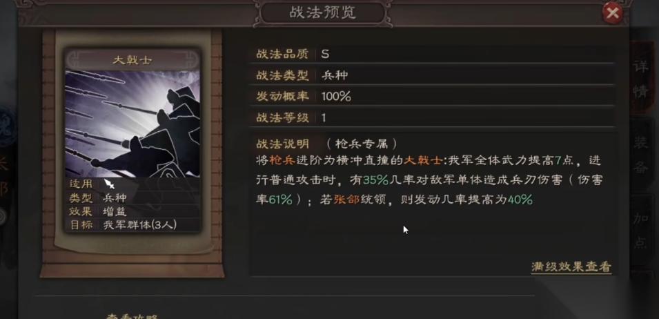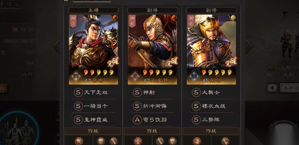 张郃必须融入纯枪兵体系,因为他仅有枪兵适性达到了最高的S级。理想的队友是那些自身拥有出色武力属性、高额普攻输出能力或连击效果的S级枪兵武将,这样才能最大化大戟士的伤害收益。可以与拥有缘分加成的东吴武将组合,利用其属性提升和伤害减免效果构建攻守兼备的体系。另一种思路是搭配具备强大群攻特性或能为团队提供增伤效果的武将,在前几回合打出压制性的爆发。无论选择哪种搭配,都必须确保队伍中的核心输出武将具备稳定且高效的普通攻击能力,以避免大戟士的珍贵效果被浪费。要特别注意规避与弓兵队伍的交战,尤其是那些携带盛气凌敌等克制普攻战法的队伍。