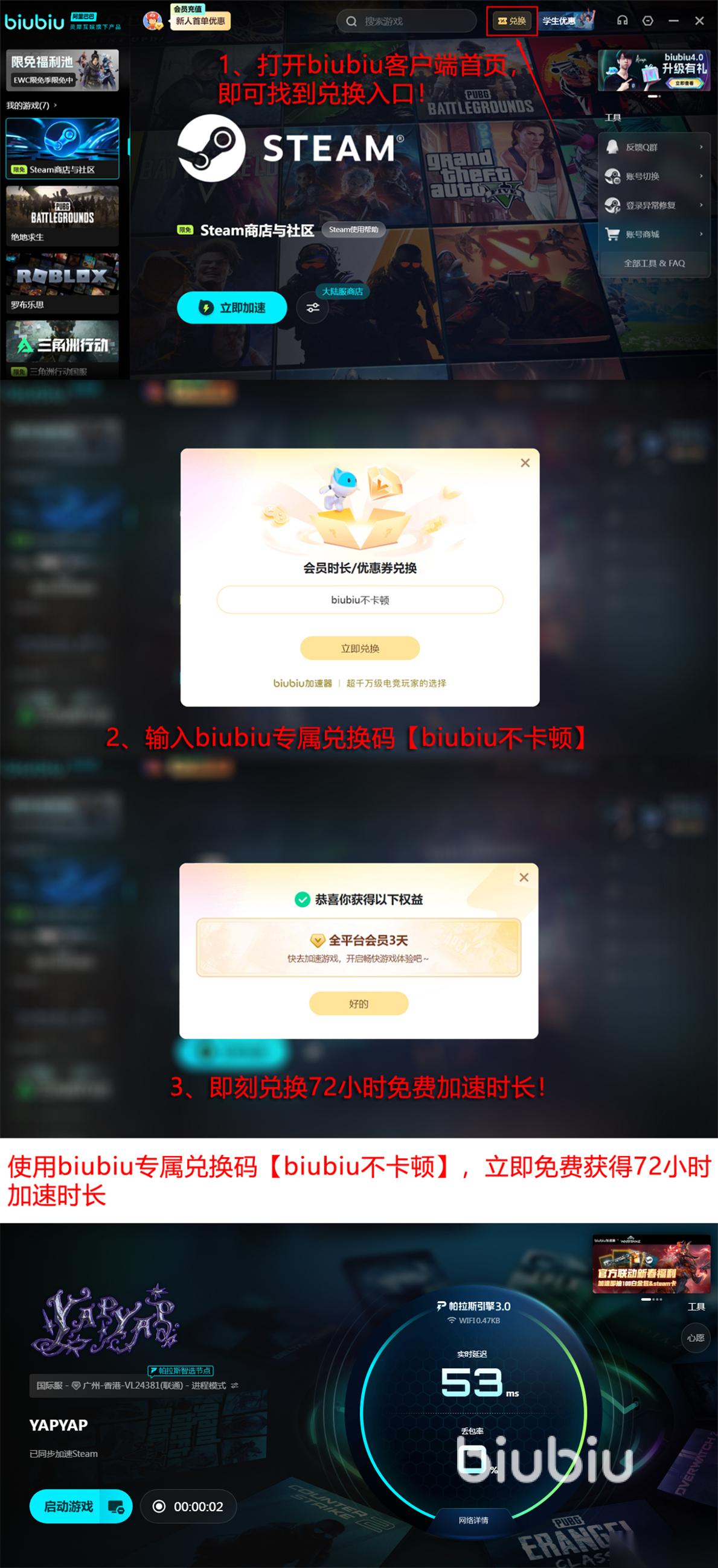 现在大家只需要注册个新号,就能享受到24小时的免费加速时间,所以新人完全不用担心性能方面的问题。每个号通过兑换码【biubiu不卡顿】够兑换得到72小时加速时间的活动现在继续生效。那么现在新人两项活动加起来就有96小时的免费加速时间,可以放开手脚去体验了。