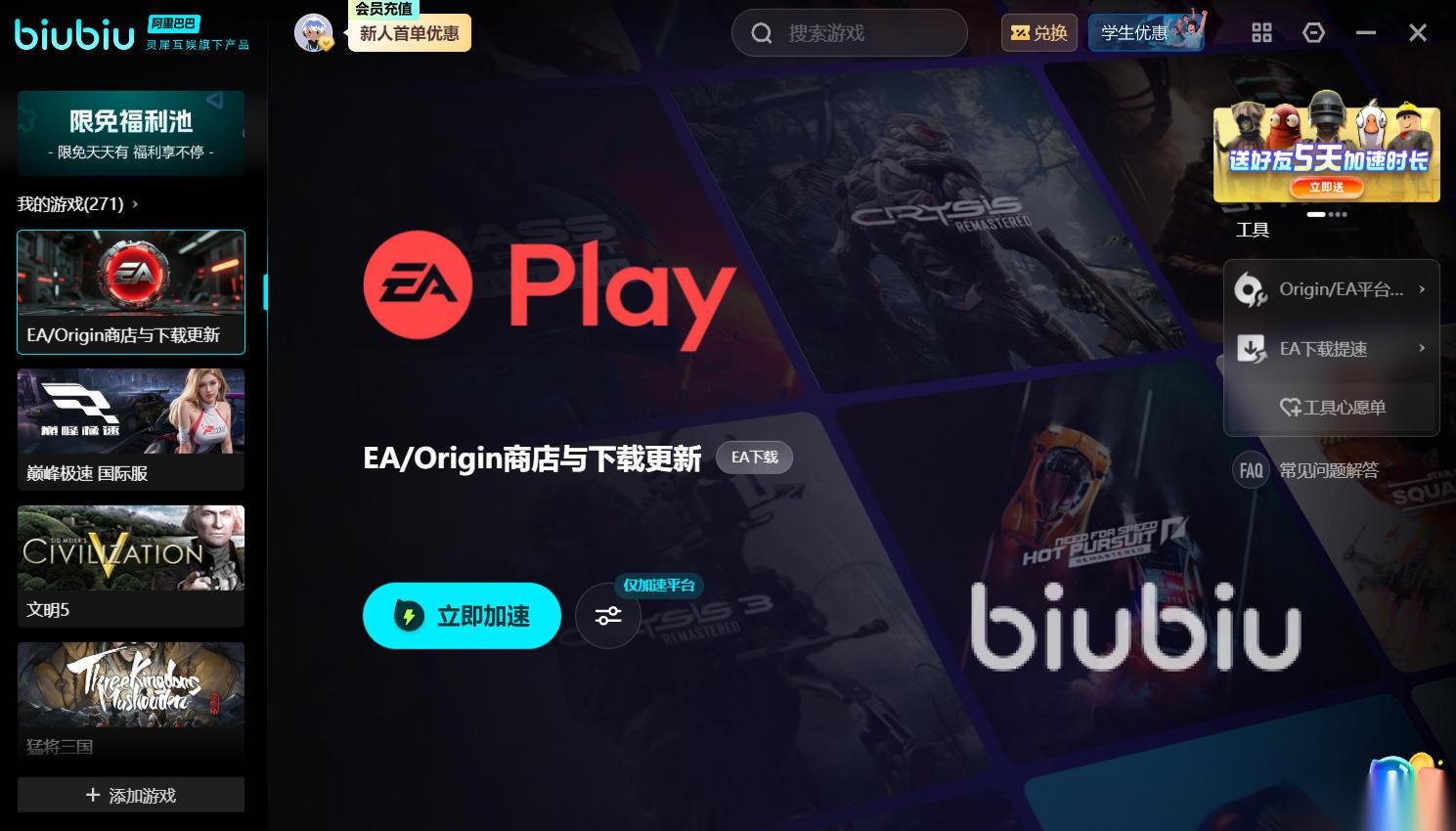 ea平台中覆盖的游戏类型特别多,也是兼容性很广的,可任由大家在其中挑选到刺激的枪战类游戏,或者是让人肾上腺素瞬间飙升的竞速类游戏。免费加速ea平台的的加速器是自古以来人们都比较关心,又特别在意的话题,因为很多游戏都提供多样化的区服,想体验海外服时,难免会遭遇到很多的障碍和阻碍,因此最优质的解决方案就是选择综合性能最强大的biubiu加速器。