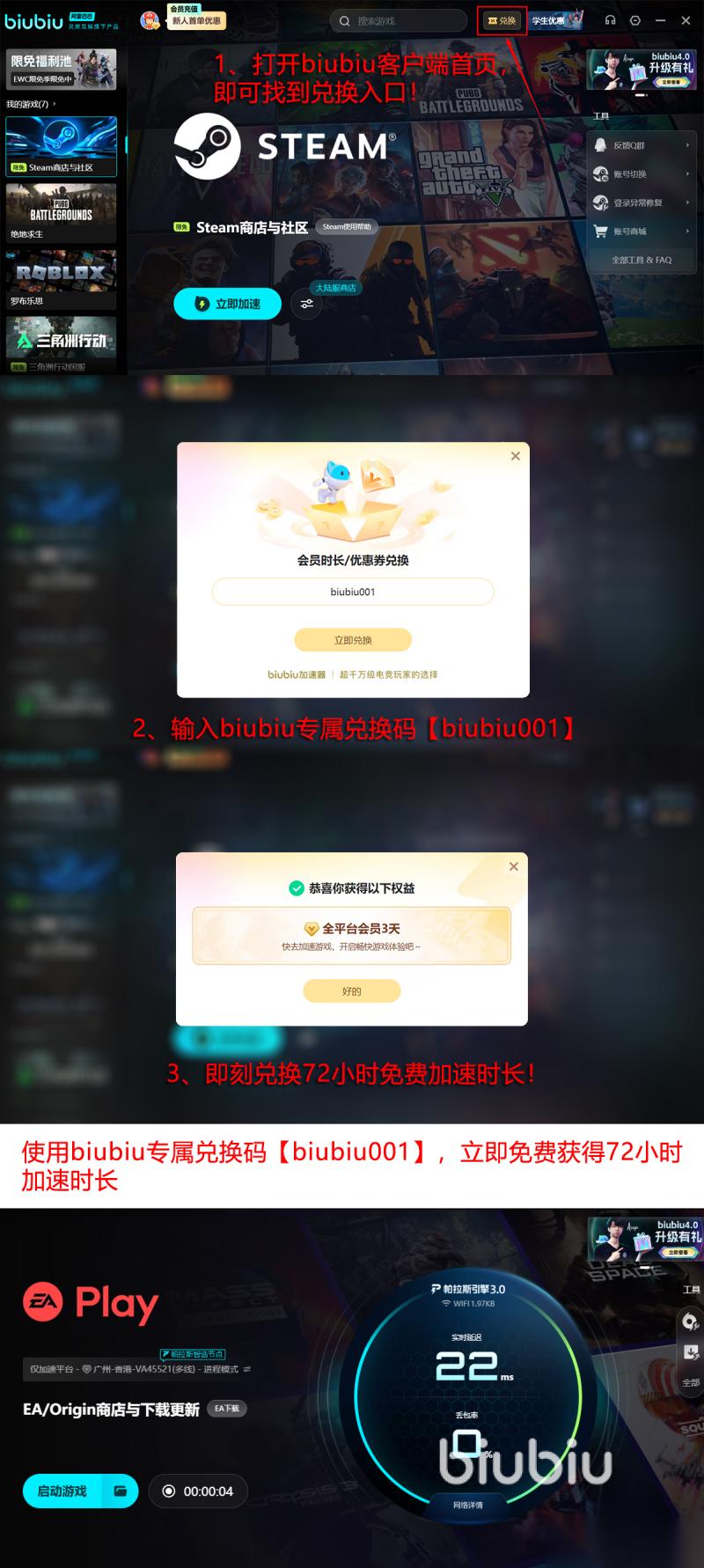 在福利方面都是出自于所有玩家的角度去考虑问题。为了避免大家在体验的时候会出现踩雷,或者在还没有体验之前就开通会员,花费大量的金钱,那么此时就推出了很多福利的政策。首先,当大家成功注册后就会拥有24小时的免费加速特权,当使用完之后再使用【biubiu001】,额外兑换三天的免费特权,那么这样算下来就共计达到了96小时。
