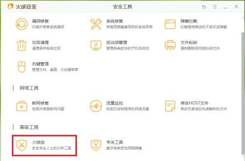 第三步:点击“高级工具”下面的【火绒剑】。