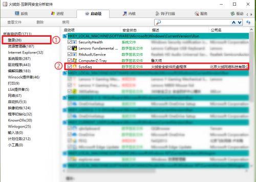 第五步:点击“所有启动项”下面的【登录】,在右侧窗口中找到“火绒安全软件托盘程序”项,然后点击鼠标右键。