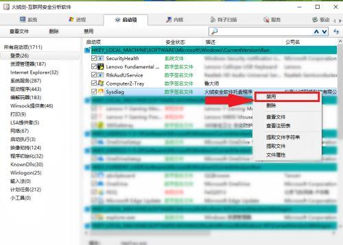 第六步:在弹出的菜单点击【禁用】,即可关闭火绒安全软件的开机自启动。