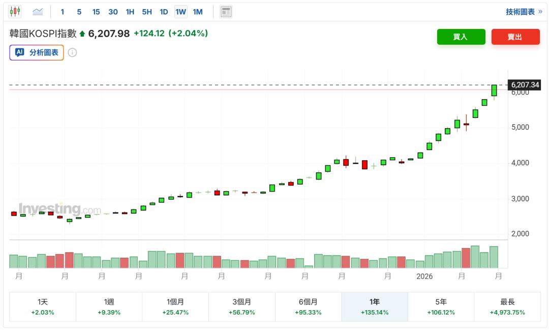 周四,2月26日,韩国KOSPI指数大升超2%,站上6200点再创历史新高!继2025年全年大升75.63%后,近两个月指数再度狂飙47%,领升全球。韩国股市总市值今年接连超越法国和德国,在全球股市市值排名中位列第九。