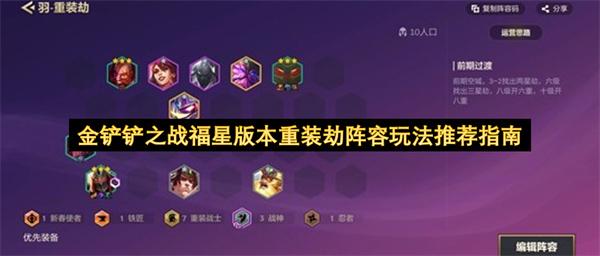 在《金铲铲之战》福星版本中,重装劫是一套围绕“天选重装劫”构建的公式化阵容。核心思路是前排堆叠高坦度拖时间,劫切入后排完成收割。下面将带来金铲铲之战福星版本重装劫阵容玩法推荐指南,希望能够帮助到各位。