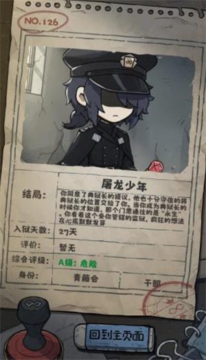 结局三屠龙少年:需要狐狸好感200所获得的U盘,典狱长好感度到达200会让你给他保释卡解锁结局,【好感度满200便可触发对话,别把保释卡当礼物送了】选择此结局给你个手机,让你抽卡抽门票,手机里的奖池消耗物是神秘代币。抽到100张门票后将典狱长多年累积的9900张票转移到自己账号后,会再次触发结局选项,如果选择接受典狱长的提议便可触发此结局。