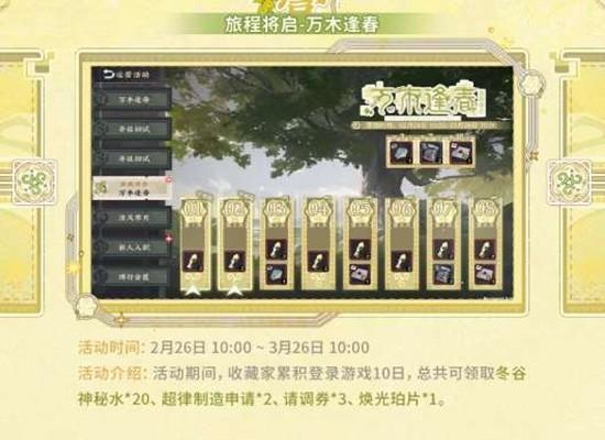 活动规则:活动期间,收藏家累计登录游戏10日,总共可领取冬谷神秘水×20、超律制造申请×2、请调券×3、焕光珀片×1。