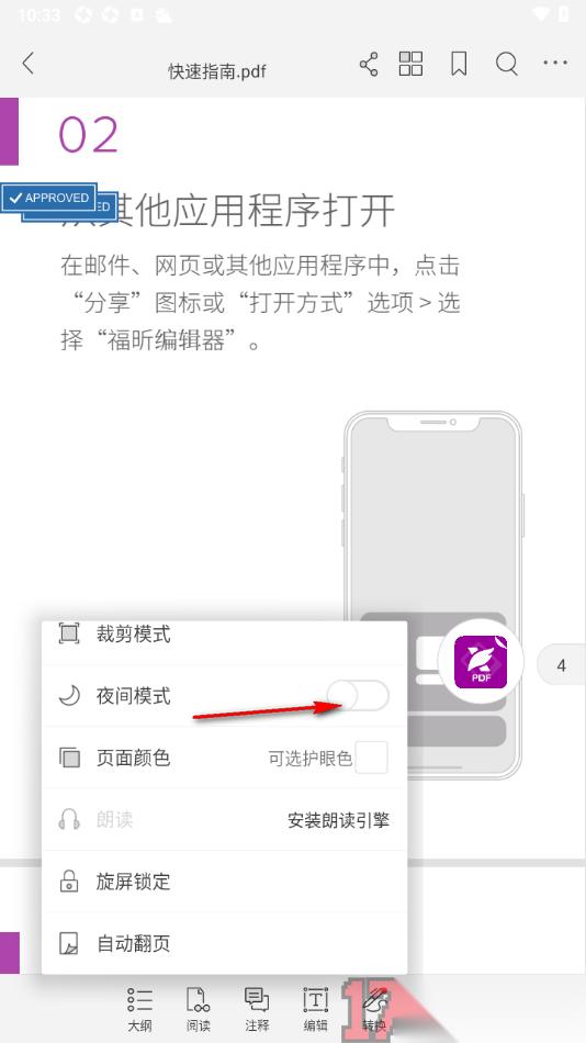 福昕PDF阅读器APP是一款专门用来阅读PDF文档的办公神器,在该应用中提供的PDF文档编辑功能非常齐全,能够帮助用户完成对PDF文档的设置,在编辑PDF文档时,一些用户不喜欢文档页面看起来太过于单调,想要设置文档背景高级显示,那么可以尝试将夜间模式启用,之后文档页面的背景会显示为暗黑色,看起来非常的高级和炫酷,而想要设置夜间模式需要在编辑页面中将阅读设置窗口打开,找到夜间模式功能启用即可,不仅如此还支持设置页面颜色、手动裁剪页面内容以及设置自动翻页文档页面等。