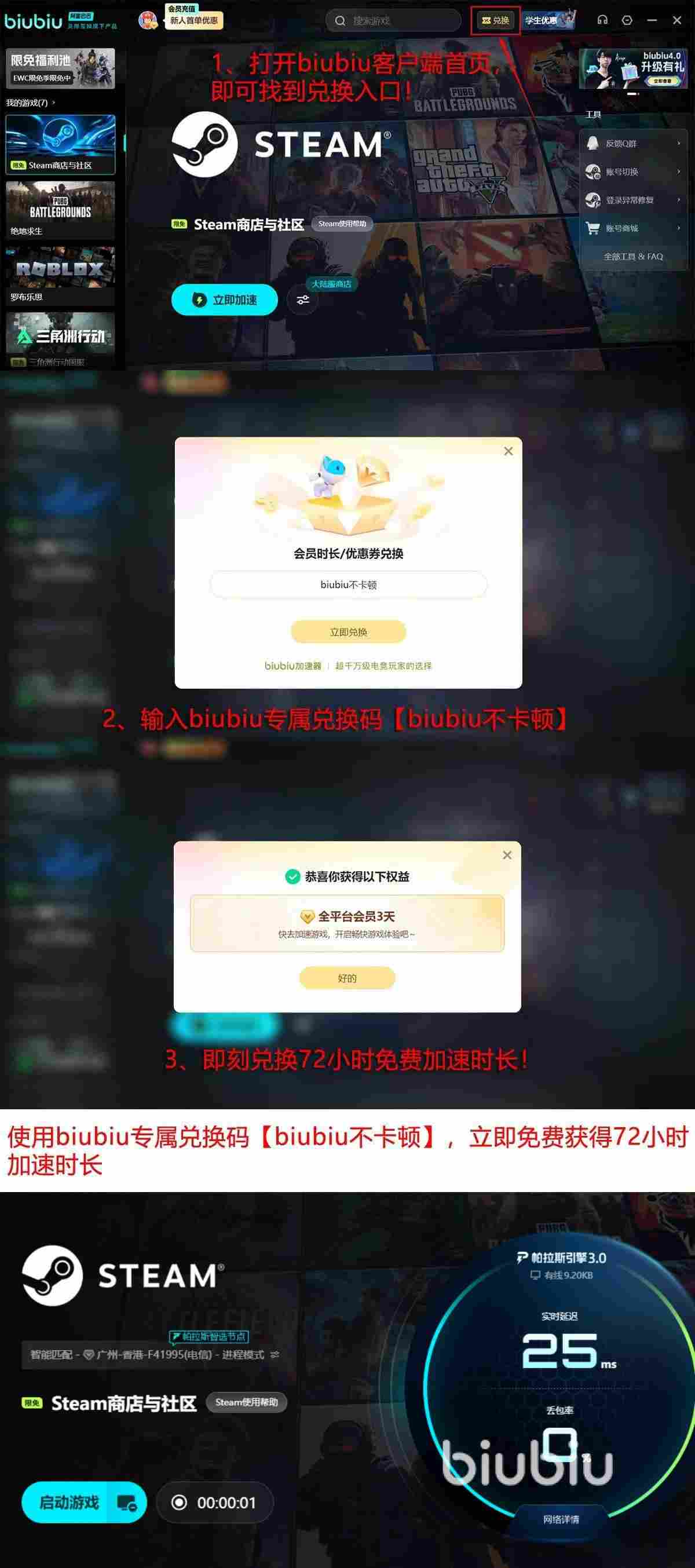 除此以外,该加速器对于新用户也有着不错的福利。新用户第一次进入的时候可以获取到24小时的免费加速时间。在使用兑换码【biubiu不卡顿】后,咱们还可以额外的获取到72小时的免费加速时间。