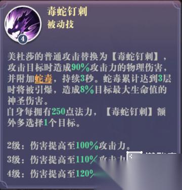 是美杜莎输出的主要技能,也不是主动释放的,普通攻击会给敌人施加蛇毒效果,每层每秒造成敌人1%的最大生命伤害,持续三秒。