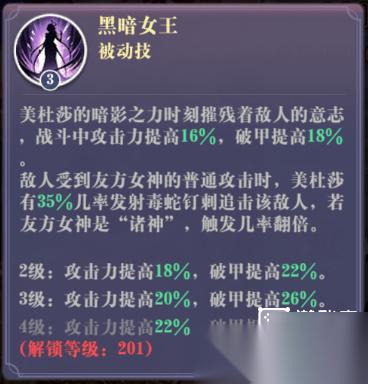 又是一波属性提升,队友攻击时,美杜莎有35%的概率追击目标一次,诸神英雄概率翻倍;满级增加22%攻击30%破甲,跟一技能叠加一起有75%的攻击加成,非常恐怖,配合烛龙星眠的45%攻击和星雨耳环的50%可以达到逆天的170%加成,要攻速有攻速,要攻击有攻击,还有最大生命百分比伤害,不管你是肉还是脆皮,美杜莎都能快速清空你的血条。