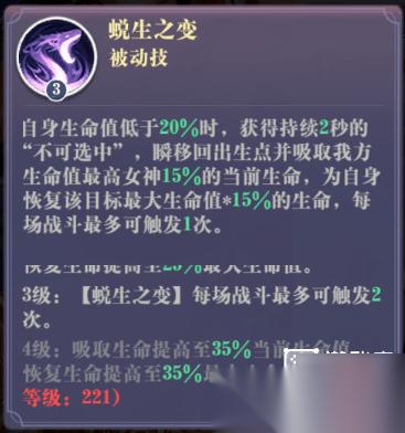 一波保命技能,增加了容错率:生命低于20%会无敌2秒并返回出生点,并吸取我方生命最高单位35%的血量给自己回复,每场战斗可以触发2次,等于在本来就难死的情况下又多了2条命。