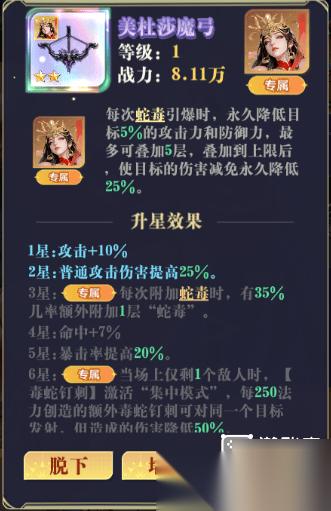 3、因为升到彩可以觉醒一阶,所以开局5次闪避大大提高了生存能力,已经不是单纯的挂件卡了,可以替代除主c辅c之外的所有英雄,核心中同层次没有谁能顶替美杜莎的作用。