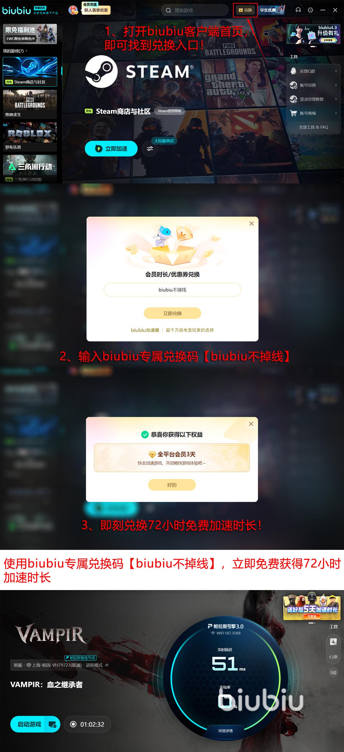 另外,第一次注册除了本来就会送的24小时基础时长,还可以用【biubiu不掉线】多领3天,两个加起来一共能拿到96小时的免费服务。