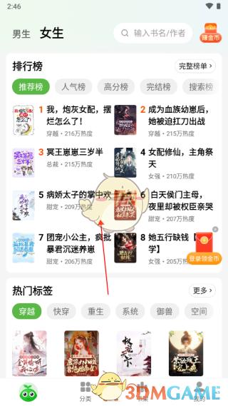 2、比如小编选择的是女生小说,进入后就是女频频道