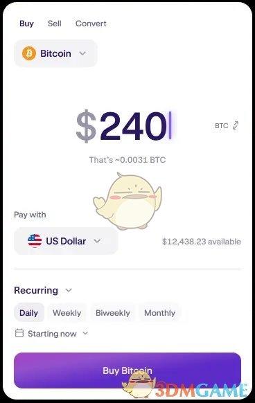 3、输入您想要买入的法定货币金额,或选择可用的法定货币选项以输入您想要买入的加密货币数量。在点击“买入”按钮之前,请确保您选择了正确的“支付方式”和“频率”。注意:您可以使用法定货币余额、借记卡或信用卡、Apple Pay 或 Google Pay 或者 Plaid ACH 进行支付。