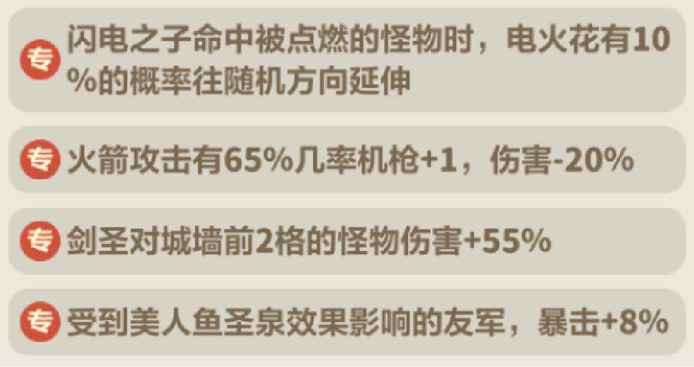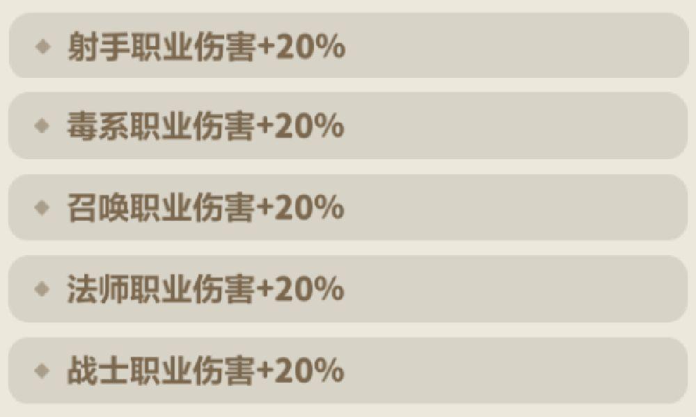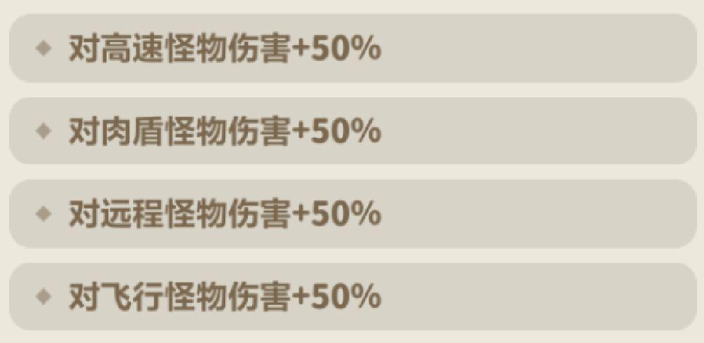 职业增伤、怪物类型增伤、前三波增伤、负面状态增伤等根据不同的阵容和关卡灵活搭配方能伤害最大化。