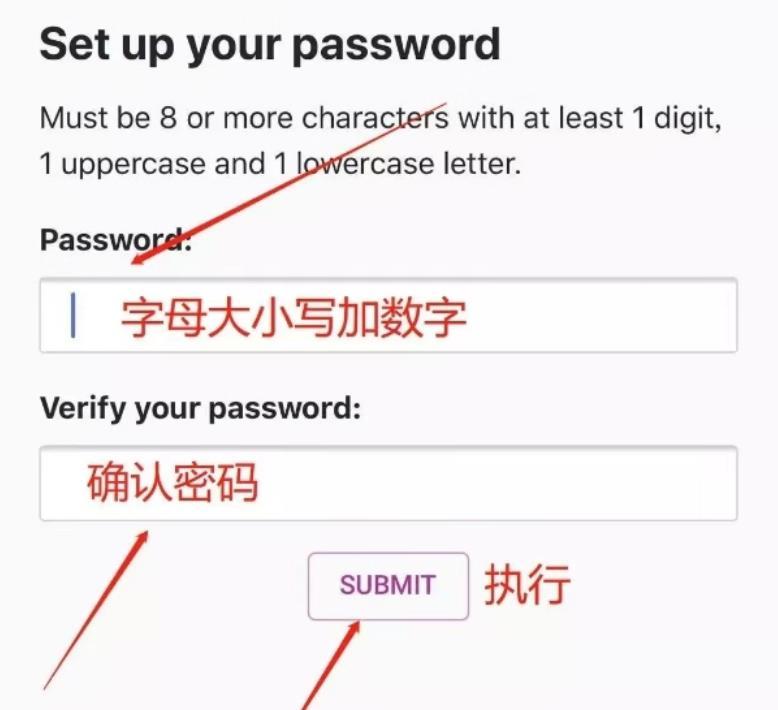 9、填写密码并确认密码(密码长度大于8位的大小写+数字组成),点击“SUBMIT”即可成功修改密码。
