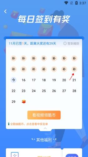 酷匠阅读app签到怎么补签,用户在本站下载安装好软件,点击手机桌面图标,打开app,首先用户需要点击右下方的我的按钮,点击中间的签到福利按钮,点击其中的补字按钮,选择你补签的方式就好了。